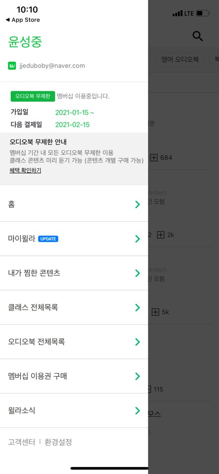 스마트폰에 윌라 앱을 설치하여 로그인하니 다음과 가입정보가 나옵니다.